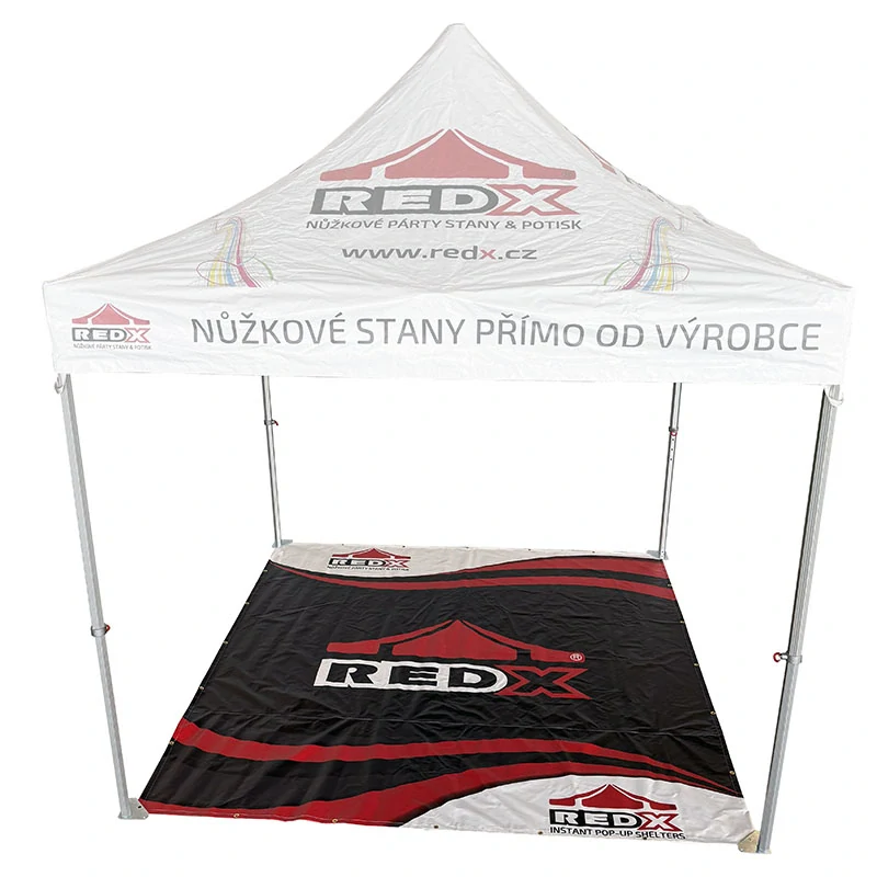 Nově nabízíme tuto podlahovou plachtu také s celoplošným potiskem, který umožňuje plochu pod stanem plně využít pro branding nebo navigační prvky. Potisk realizujeme digitální sublimací po celé ploše, díky čemuž vyniknou barvy, detaily i grafika ve vysoké kvalitě. Podlahová plocha se tak stává nejen praktickým, ale i vizuálně výrazným prvkem, který podpoří celkovou prezentaci značky přímo v místě kontaktu se zákazníky.